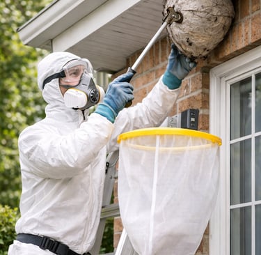 Safe removal of wasp and hornet nests from roofs, trees, and structures with protective equipment and prevention.